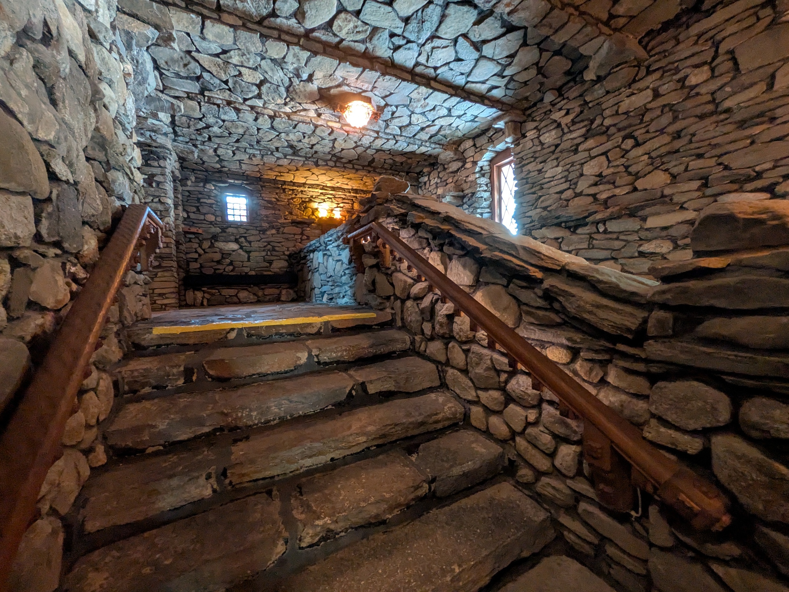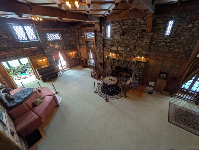 Upon entering the castle, the interior is quite imposing. The foyer is quite small, with a bathroom immediately in front of you positioned at about 2 o’clock. To your left is the only other option: the staircase leading up to the great room. It’s really very funny how different the rest of the house is, and of course this is pure theater from a man who spent his life on the stage.