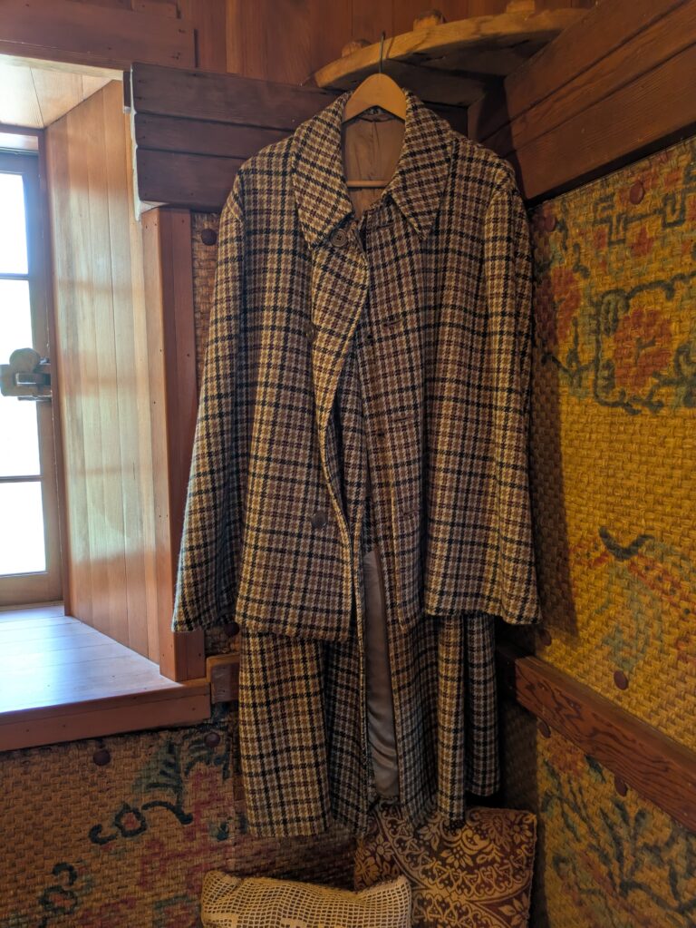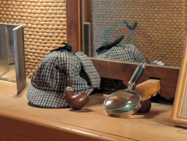 The famous deerstalker cap, a briar pipe, magnifying glass, and tweed coat are pictured below as well. I’m not sure why they chose a briar pipe for this display, as I’m pretty sure Gillette mostly used a calabash meerschaum on stage, but perhaps he used a briar as well. I think briar may have been more true to the books.