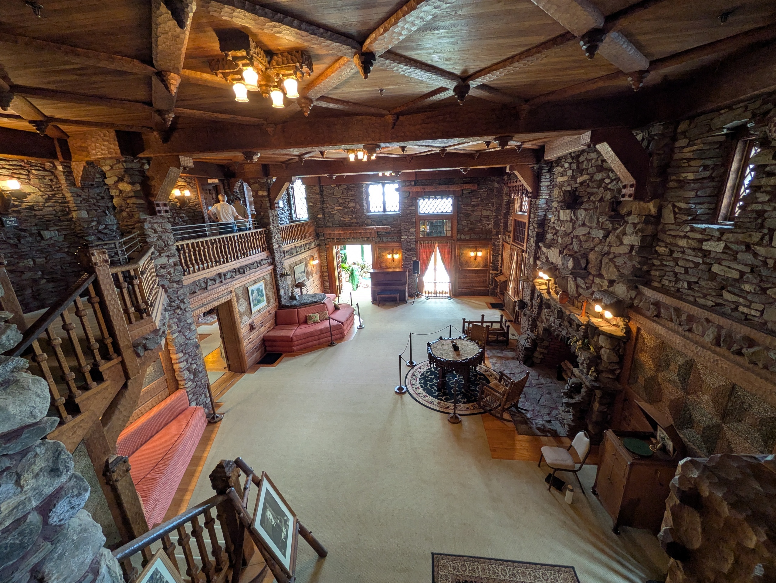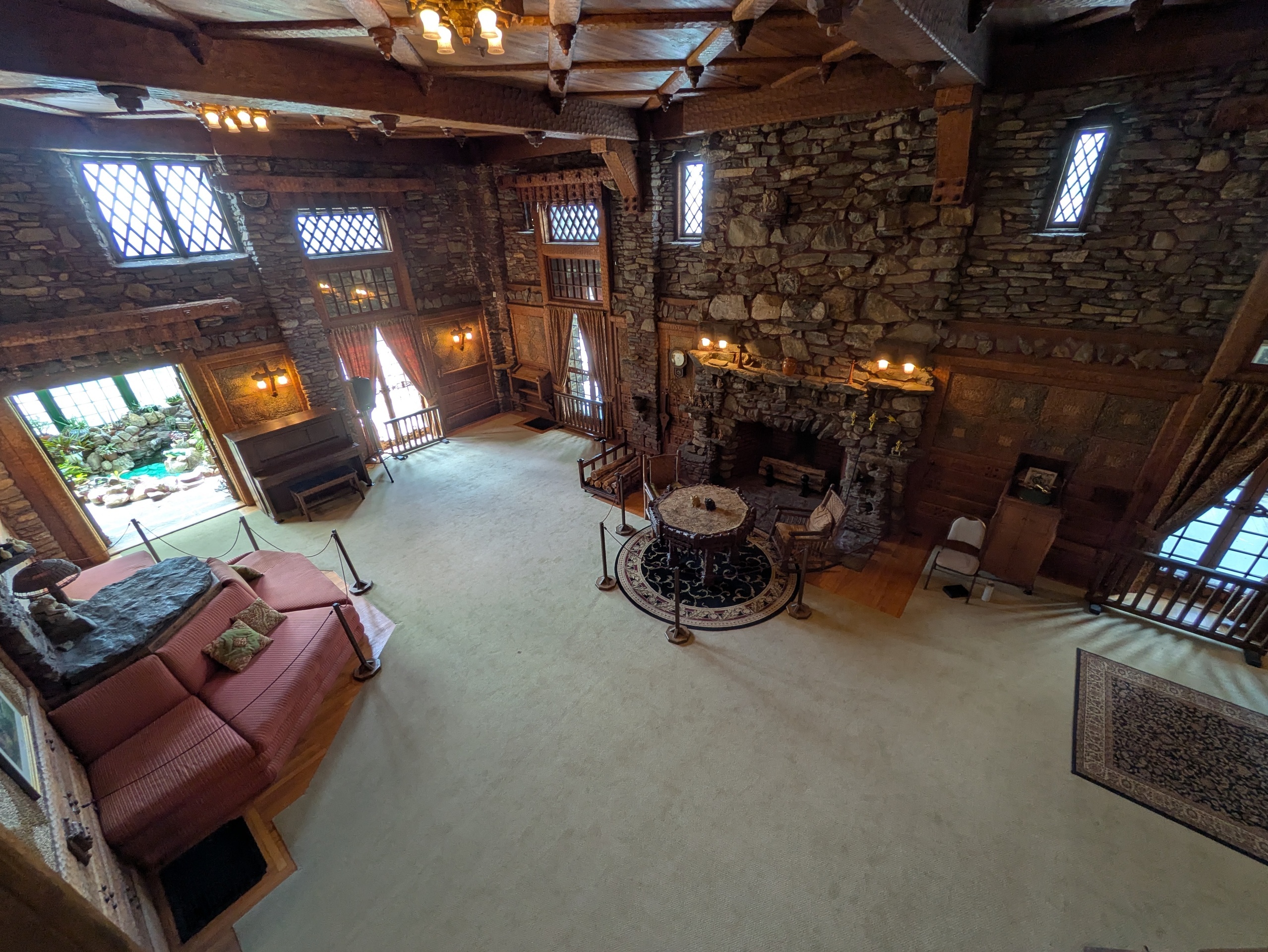 As soon as you exit the staircase, you enter the great room, around which the rest of the rooms encircle. Dining area, conservatory, study, etc. on the first floor, bedrooms on the second. Two views from the second floor are below. The great room is an interesting space, especially because Gillette was not given to entertaining large groups, preferring to host one or two prominent men of his era at a time.