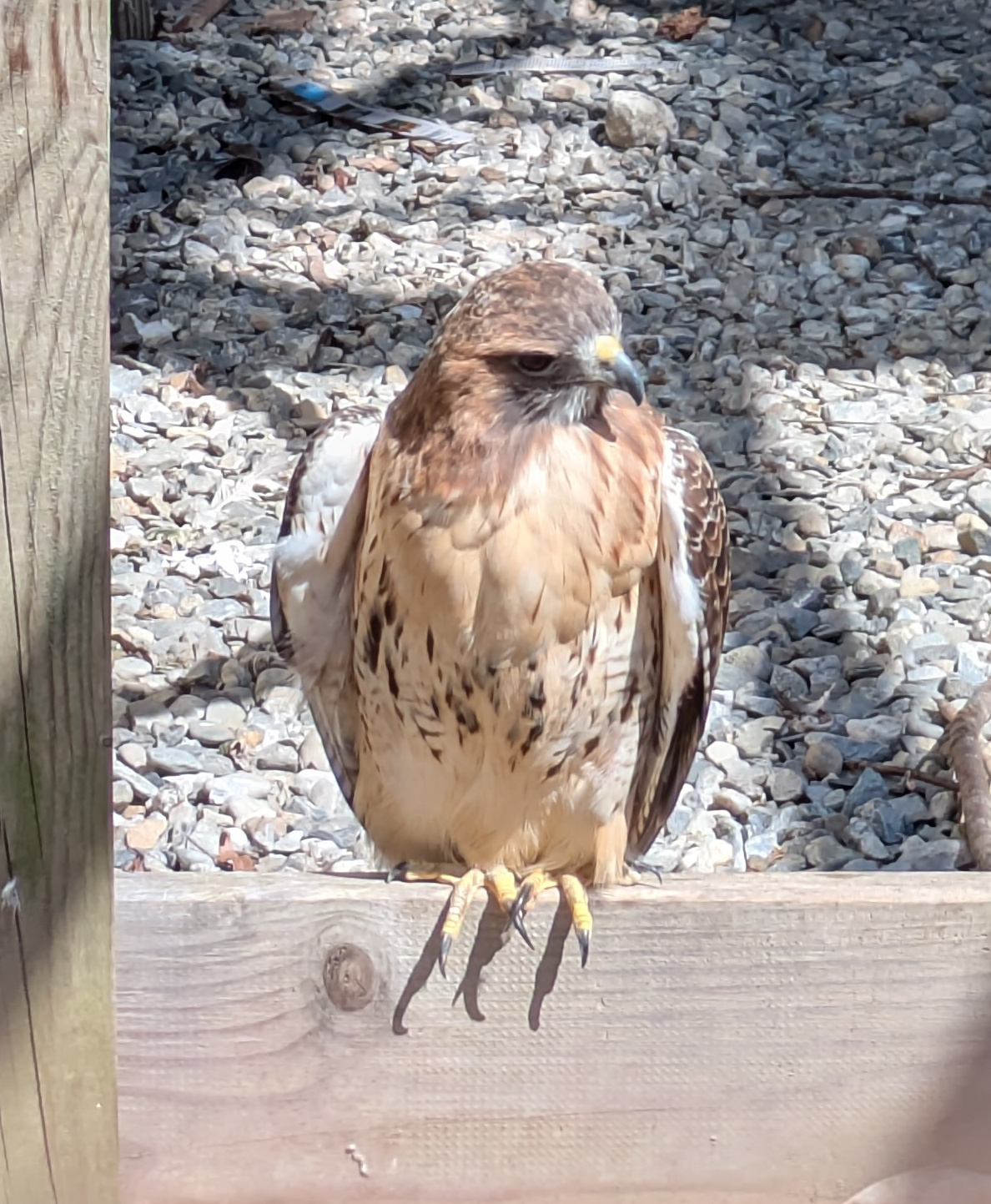 The first beak you see when you arrive at the aviaries is a red tailed hawk.